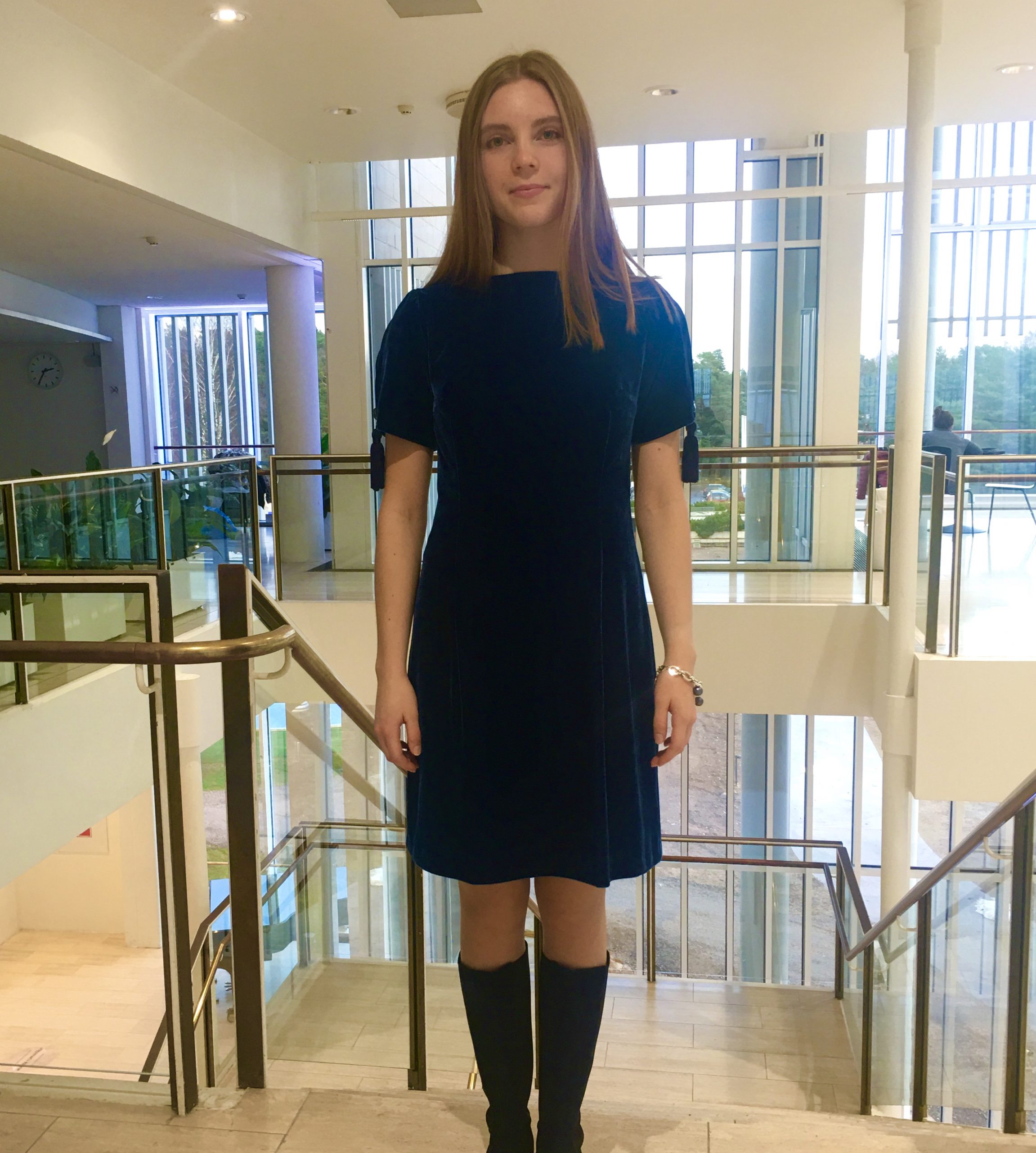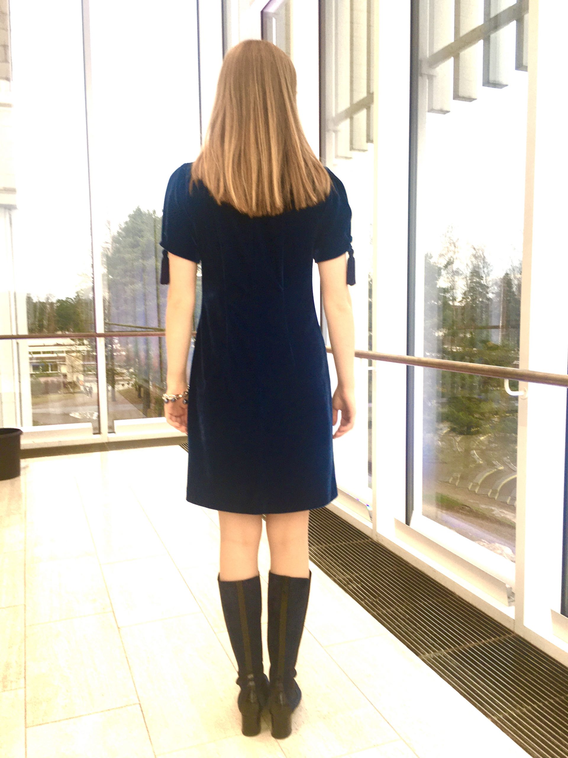 The dress can be made out of slightly stretchy polyester-spandex which is the blue one here. Other colors are wine red, black or fuchsia. But the dress can be made also out of silk-rayon velvet, which is  high quality; hangs nicely, shines and is rich in color depending on the lights. You can see that dress in black on website. Other colors as black in silk-rayon material are: dark red, dark green and dark blue. Price is then 225 euros.