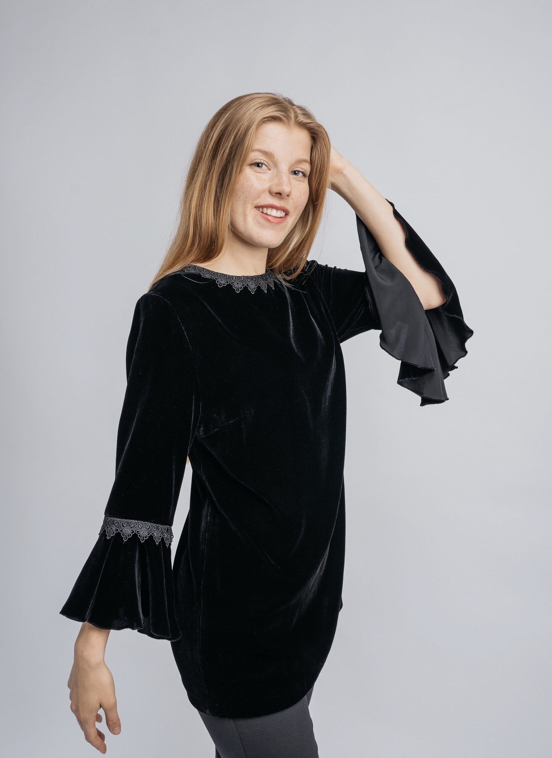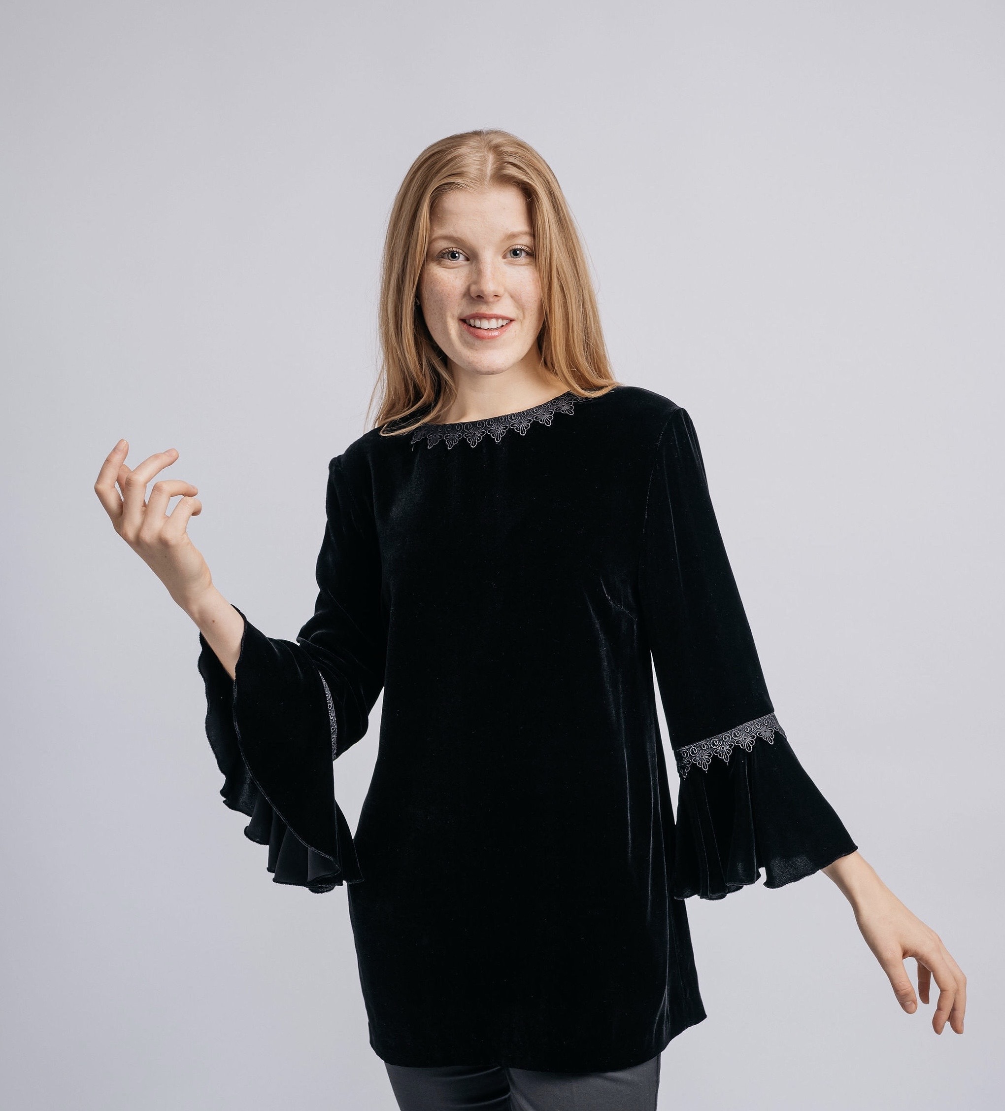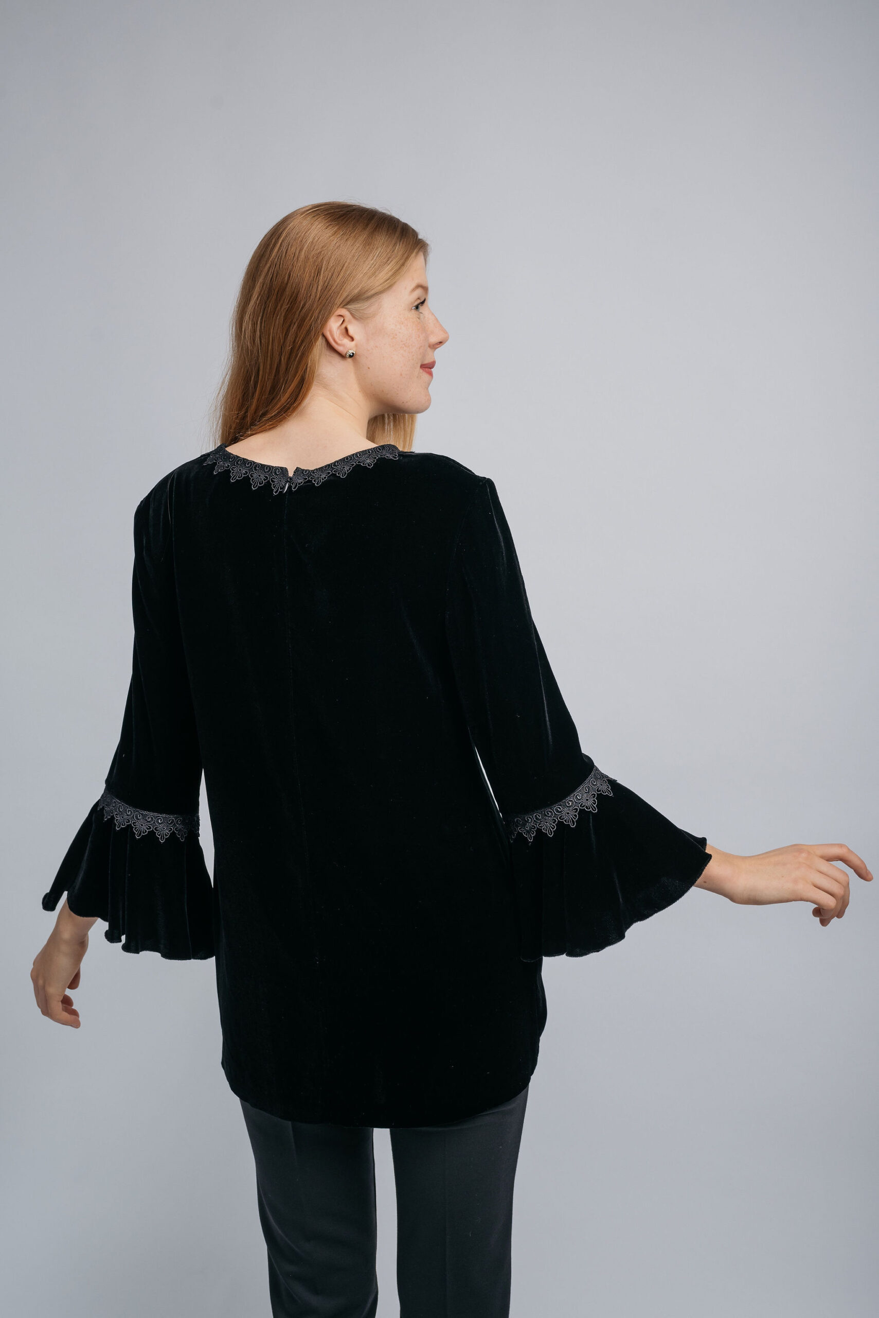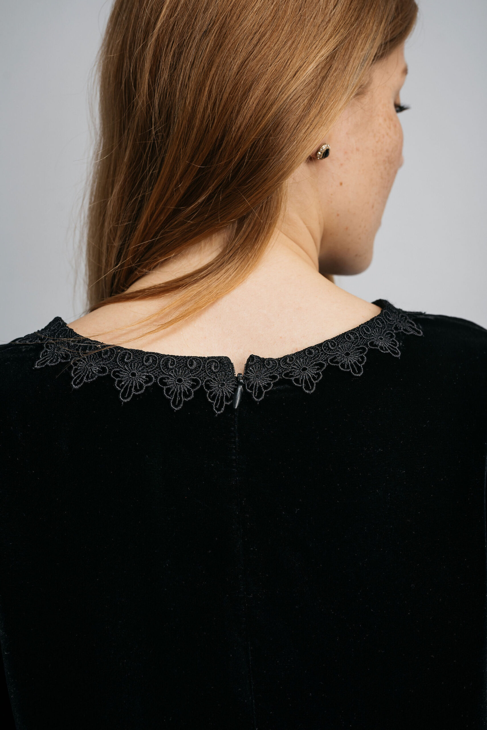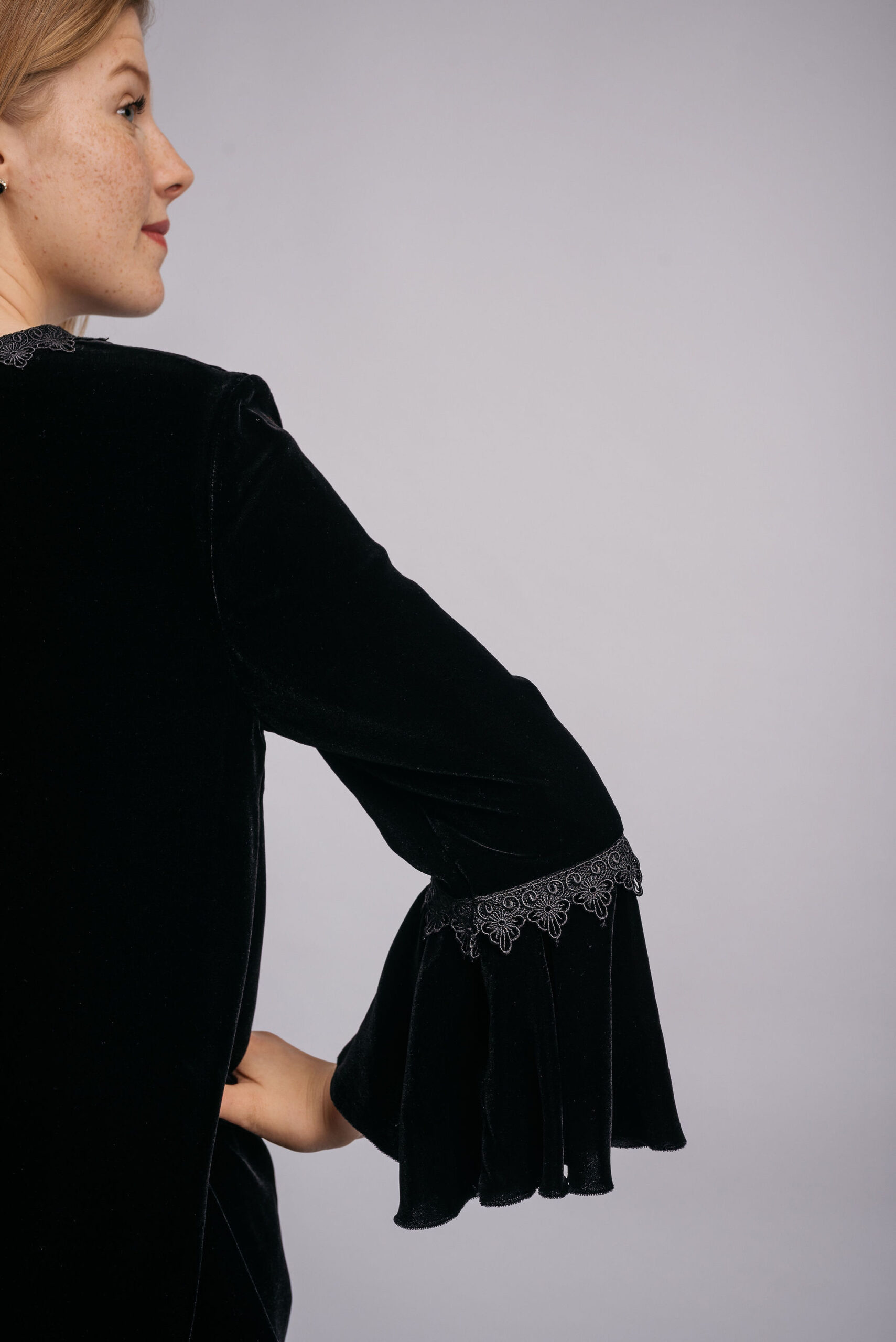 A-lined tunic out of silk blend velvet! Velvet is very rich in color and it is shimmering nicely in light. Just right for parties! Sleeves have lots of gathers as detail, lace trimming around neckline and as decorations on sleeves. Tunic works also as a short black dress, the length is about 77 cm. By order it can be lenghtened and done in other colors; wine red, dark forest green and dark mid night blue.